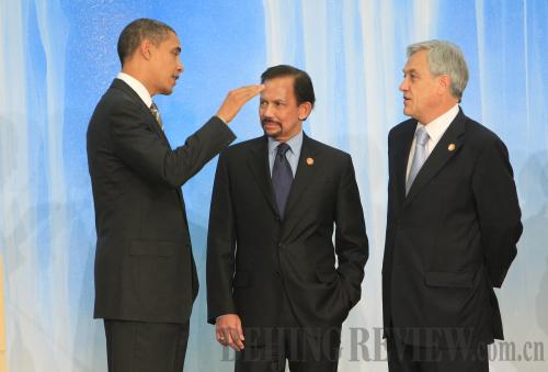 PLEASANT CHAT: U.S. President Barack Obama chats with Sultan of Brunei Hassanal Bolkiah (center) and Chilean President Sebastian Pinera during the 18th APEC Economic Leaders' Meeting in Yokohama, Japan, on November 14 (FAN RUJUN) |