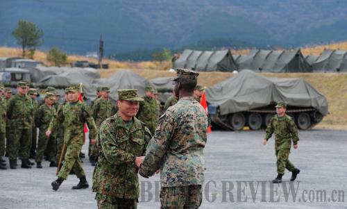 MILITARY MIGHT: Japanese and U.S. soldiers participate in the opening ceremony of a major ground training exercise in southern Japan's Miyazaki Prefecture on December 7, as part of the largest Japan-U.S. joint military exercise in history (JI CHUNPENG)