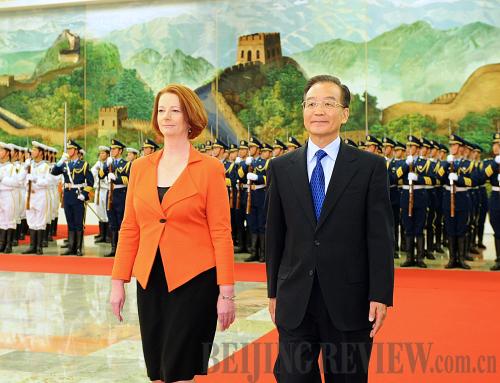 ENHANCING COOPERATION: Chinese Premier Wen Jiabao hosts a ceremony to welcome Australian Prime Minister Julia Gillard in Beijing on April 26 (LI TAO) |