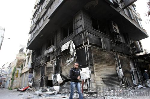 PROPERTY IN RUINS: A man passes a burnt building on March 27 in north Syria's port city of Latakia, where armed gangs took positions on rooftops across the city (XINHUA/AFP)