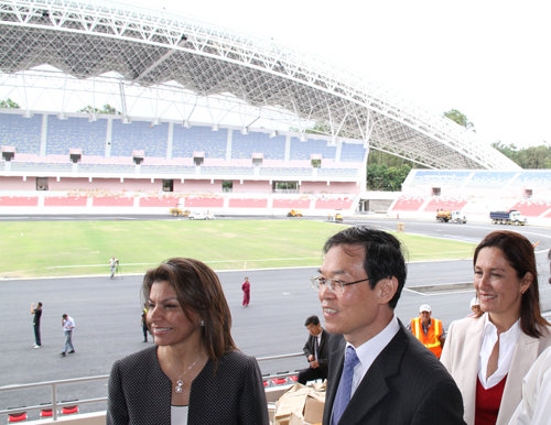 A NEW LANDMARK: Costa Rican President Laura Chinchilla Miranda (left), accompanied by China's Ambassador to Costa Rica Li Changhua (second left), visits the National Stadium donated by China in San Jose, capital of Costa Rica, on October 14, 2010 (YU HONGXIA)