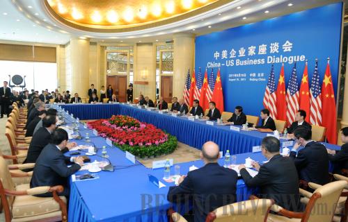 ENCOURAGING DIALOGUE: U.S. Vice President Joe Biden attends the China-U.S. Business Dialogue in Beijing on August 19, along with Chinese Vice President Xi Jinping (ZHANG DUO) |