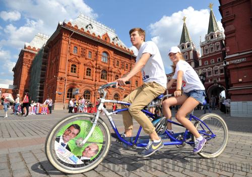 TANDEM SUPPORTERS: Supporters of Russian President Dmitry Medvedev and Prime Minister Vladimir Putin ride a tandem decorated with their pictures during a rally near the Kremlin on August 8 (XINHUA/AFP)