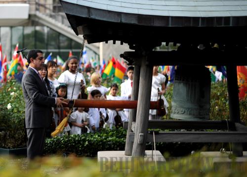 BELL TOLLS FOR PEACE: Nassir Abdulaziz Al-Nasser, President of the 66th UN General Assembly, rings a bell at the UN headquarters on September 15 to mark the 30th International Day of Peace, which fell on September 21 (SHEN HONG) |