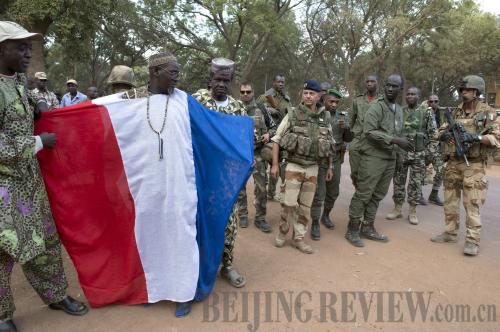 OPEN ARMS: A man wearing a cloth outfit in the design of the French national flag greets French and Malian soldiers in Niono on January 19 (XINHUA/AFP) |