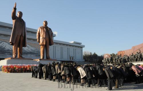 PAYING RESPECTS: Citizens of the DPRK bow in front of bronze statues of the late North Korean leader Kim Jong Il and his father Kim Il Sung in Pyongyang on February 15, a day before Kim Jong Il's birthday (DU BAIYU) |