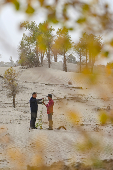 Money grows on trees The most compelling aspect of Xinjiang's current strategy is the drive to monetize the green barrier. The principle of "ecological industrialization" and "industrial ecologization" is the central pillar of the region's plan to ensure the project's long-term survival. The logic is simple: A shelterbelt that pays for itself and enriches the people who tend it is a shelterbelt that will last. The desert is being reframed as an asset with three increasingly integrated industrial models. The first is the foundational "cash crop under the canopy." Xinjiang now boasts over 722,000 hectares of sand-based economic crops, generating a staggering 28.97 billion yuan ($4.2 billion) in output value. For example, Yutian, a county that was once one of the most devastated by sandstorms, now produces about 85 percent of China's cistanche, a highly valued medicinal plant also known as desert ginseng. This model provides a direct, annual revenue stream for tens of thousands of households, transforming them from passive recipients of government aid into active stakeholders in the ecological infrastructure. ![]() Forest rangers tend to a newly grown populus euphratica sapling in Bayingolin Mongolian Autonomous Prefecture on September 19, 2025 (XINHUA)