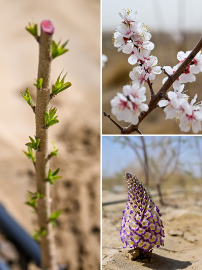 Two years ago, a nearly 300-km gap in the world's largest desert shelterbelt was finally sealed and the Taklimakan, China's biggest and the world's second-largest shifting sand desert, became encircled by an over 3,000-km green belt. The Taklimakan Desert green belt project made it to the 2025 Top 10 Global Engineering Achievements listed by the World Federation of Engineering Organizations, winning global recognition. For Xinjiang, this is more than recognition; it is the validation of a decades-long campaign to push back desertification. However, the "locking" of the desert's edge is not the end, but a beginning. The Forestry and Grassland Bureau of Xinjiang held a briefing in February, explaining that from a singular containment focus, efforts have now shifted to a complex and sophisticated strategy of consolidation, economic integration and sustainable governance. The challenge now is not only to hold the line but to widen it, to make it yield economic benefits, and to ensure its long-term ecological and social viability. ![]() This combo photo shows a rose seedling (left) and cistanche (bottom right) in a sand-control model zone in Yutian County, Hetian (Hotan) Prefecture, on April 8, 2025, and apricot blossoms in Baicheng County, Aksu Prefecture, on April 12, 2025 (XINHUA)
