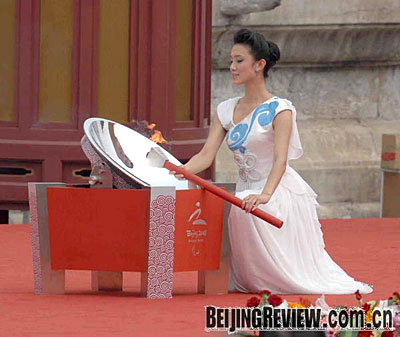 The flame was then handed to Jin Jing, the wheel chaired fencer and Olympic torchbearer known for protecting the torch from protestors in Paris leg of the relay, before it lit a torch held by Liu Qi, president of the organizing committee of the just concluded Beijing Olympic Games.