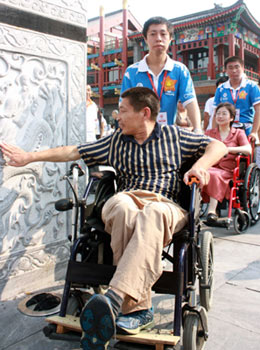 Wen Ge, chairman of "Zhang Hua Green Home", a self-help organization of the disabled in Renqiu City of north China's Hebei Province, has tried the barrier-free facilities in Beijing during the Paralympics on the invitation of a Beijing-based non-governmental organization.